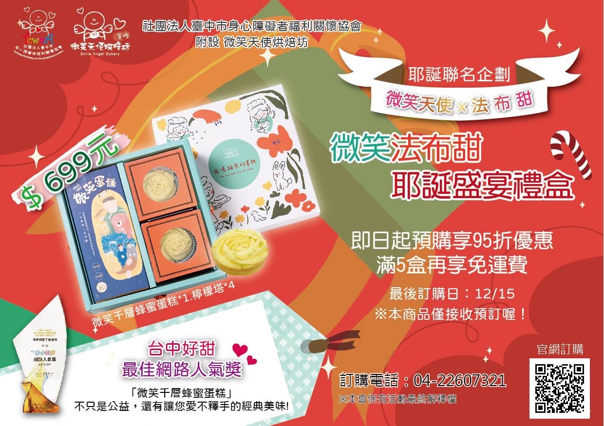 微笑天使今年在 2022 台中好甜活動當中,獲得最佳網路人氣獎,這次聖誕節與同時獲得最佳驚艷讚賞獎的「法布甜健康伴手禮」聯合推出了聖誕禮盒,以公益結合工藝,讓您一次享受到兩種冠軍美味,還沒跟上台中最新人氣甜點的人快來試試