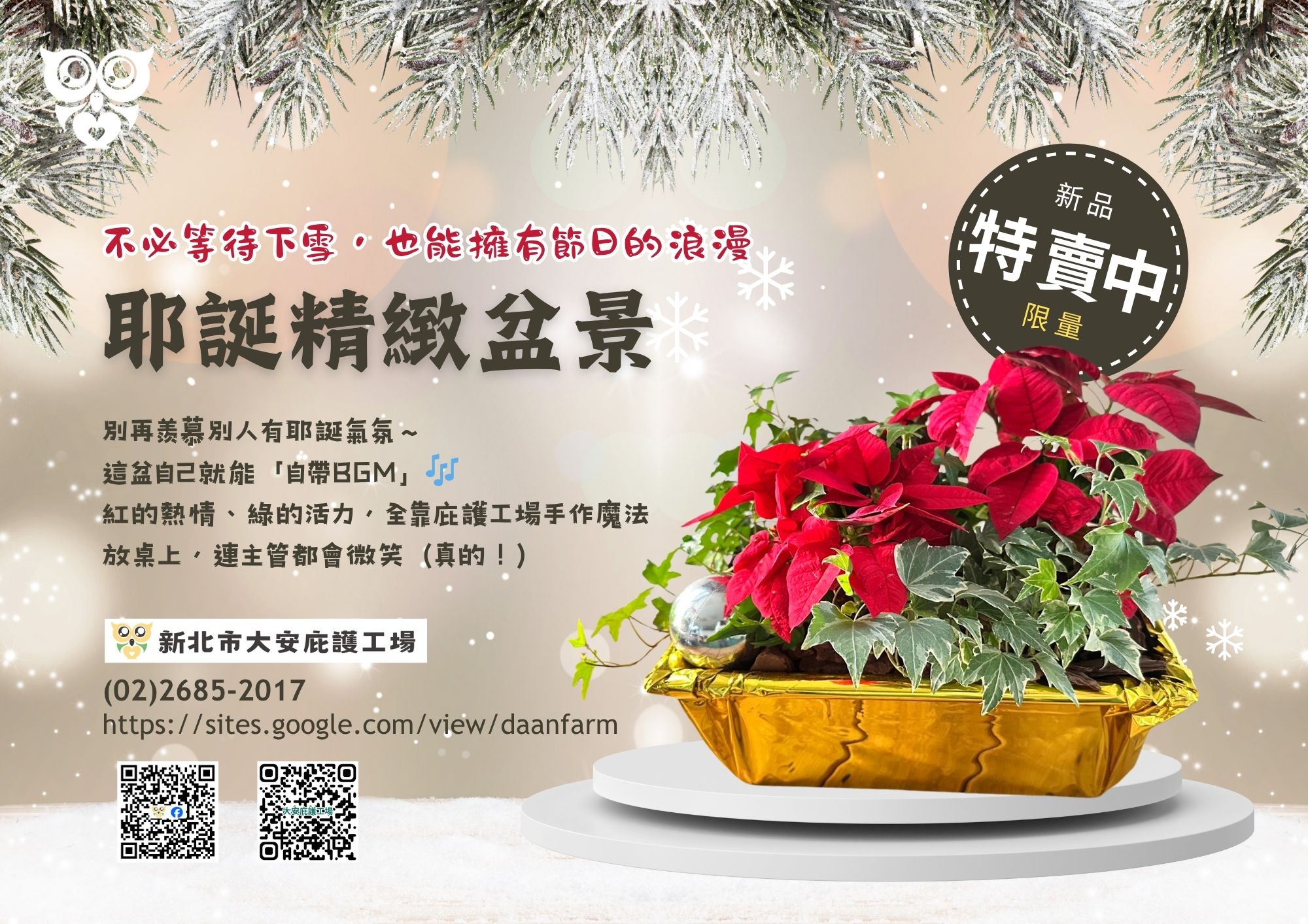 不必等待下雪,也能擁有節日的浪漫 。精緻的聖誕盆景,由庇護工場手作完成,充滿了紅與綠的熱情與活力,耶誕氣氛滿點,就從這一盆開始