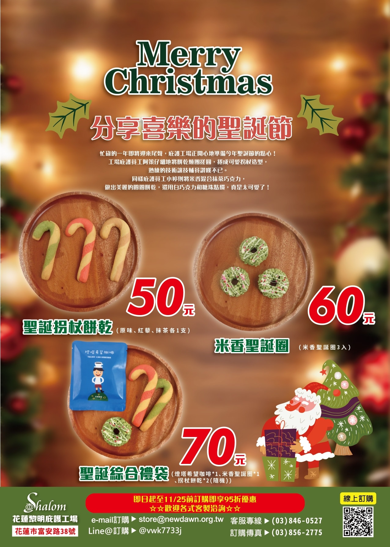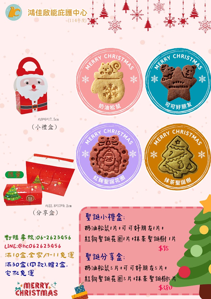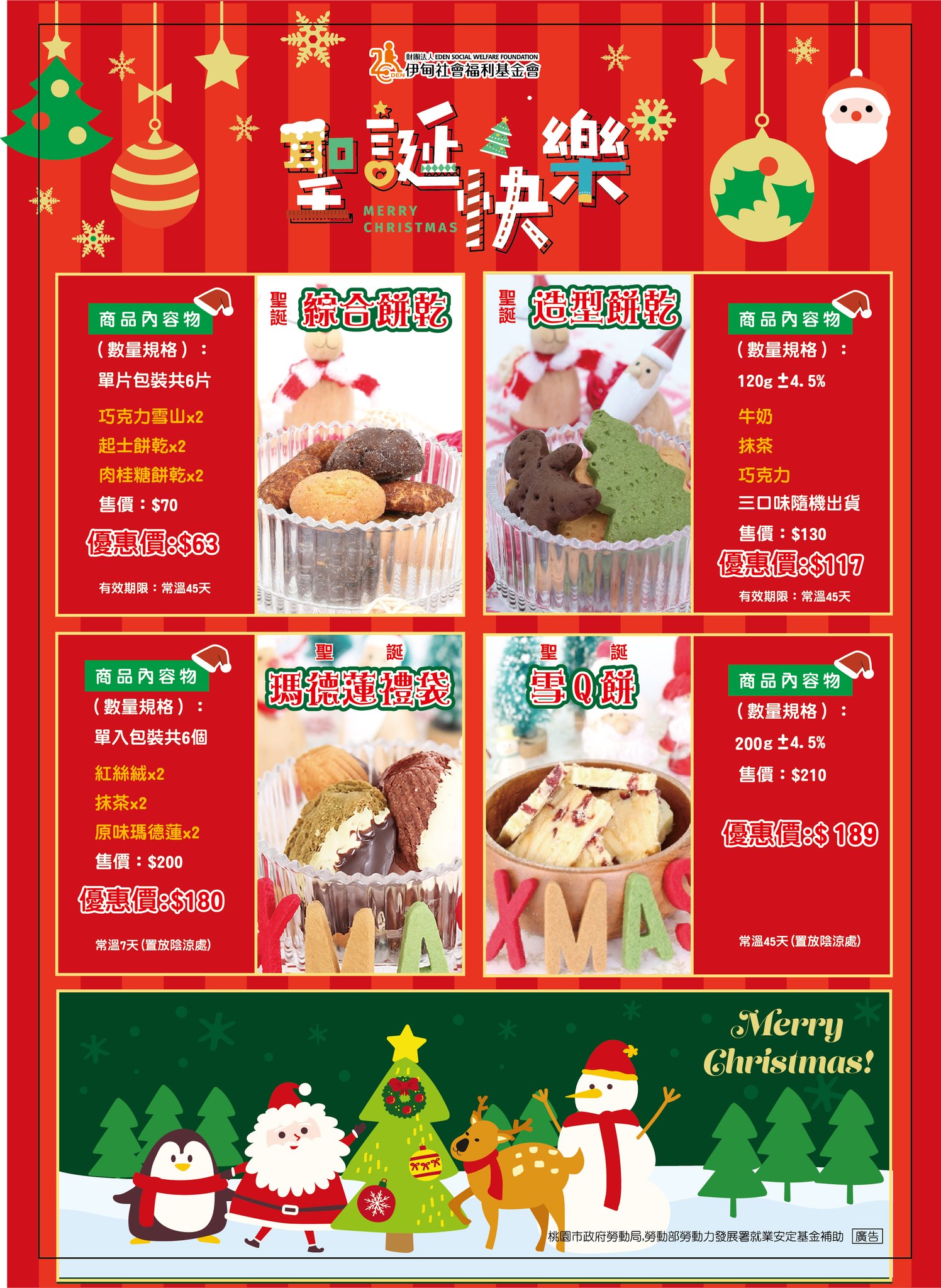 由憨兒們親手烘焙、用滿滿真心製作的幸福滋味~推出以可愛聖誕造型的餅乾禮盒,適合送給小朋友或當作交換禮物,也有認購活動,邀您和憨兒一起送愛到弱勢及偏鄉孩童