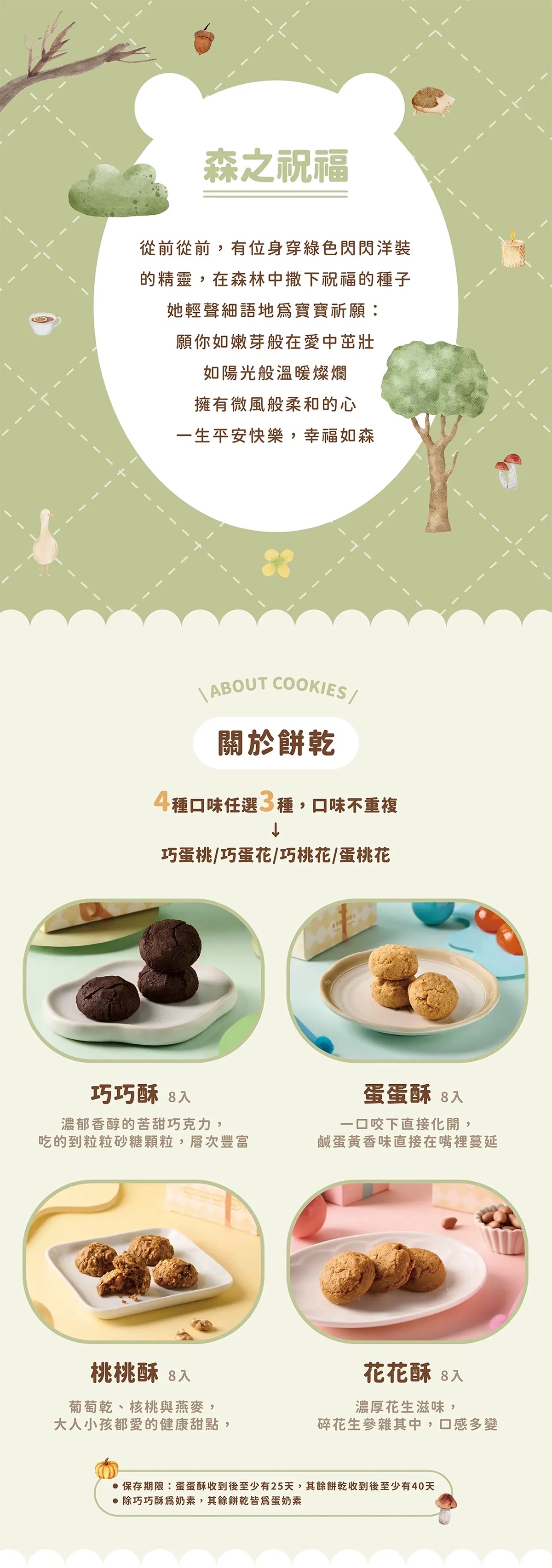 內含 3 盒 餅乾,每盒各 8 顆 ( 蛋蛋酥 / 花花酥 / 桃桃酥 / 巧巧酥 任選,可選擇三款 )